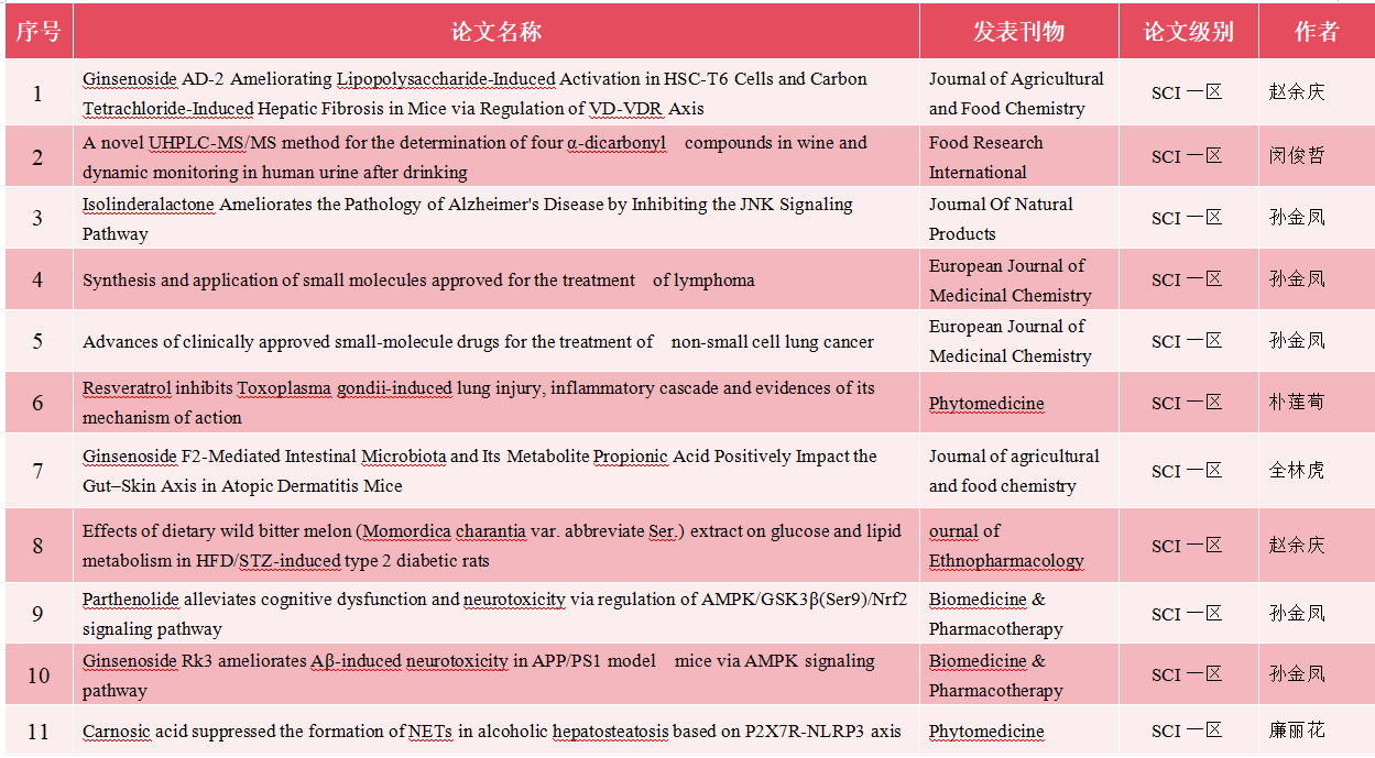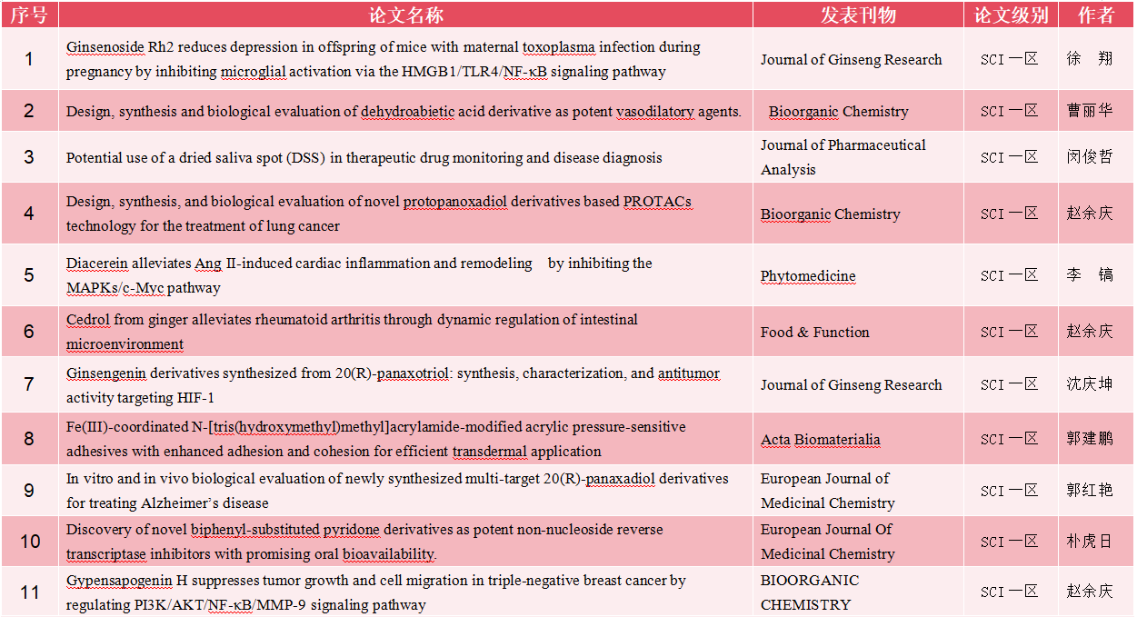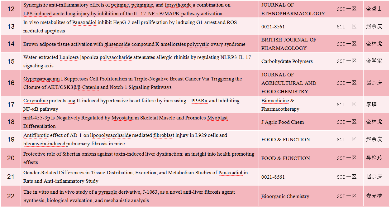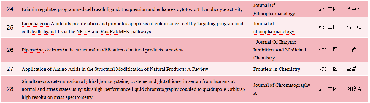 | 1 | Synthesis, in vitro and in vivo biological | 全哲山 | Acta Pharmaceutica Sinica B, 2020,10(4):628-645) | SCI 1区 |