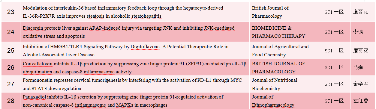 | 26 | Potentiation of hepatic stellate cell activation by extracellular ATP is dependent on P2X7R-mediated NLRP3 inflammasome activation | 廉丽花 | Pharmacol Res. 2017,117:82-93 | SCI 2区 |