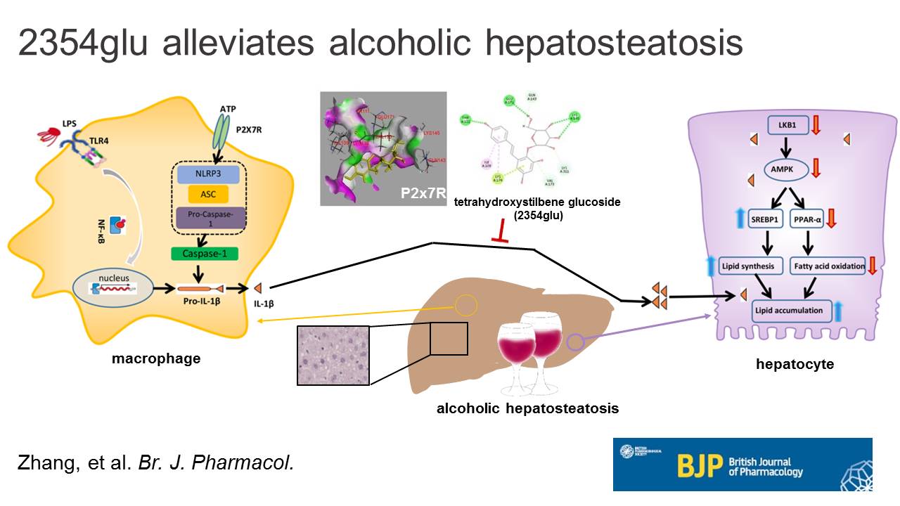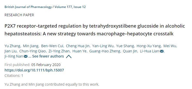 南极星教授课题组的研究论文“P2X7 receptor-targeted regulation by tetrahydroxystilbene glucoside in alcoholic hepatosteatosis: A new strategy towards macrophage-hepatocyte crosstalk”(Br J Pharmacol. 2020 Jun;177(12):2793-2811)。南极星教授和廉丽花教授为文章的共同通讯作者,吴艳玲教授与金成华老师为署名作者,博士研究生张玉和姜敏并列第一作者。该研究获得国家自然科学基金、吉林省科技厅、吉林省教育厅等项目的资助。