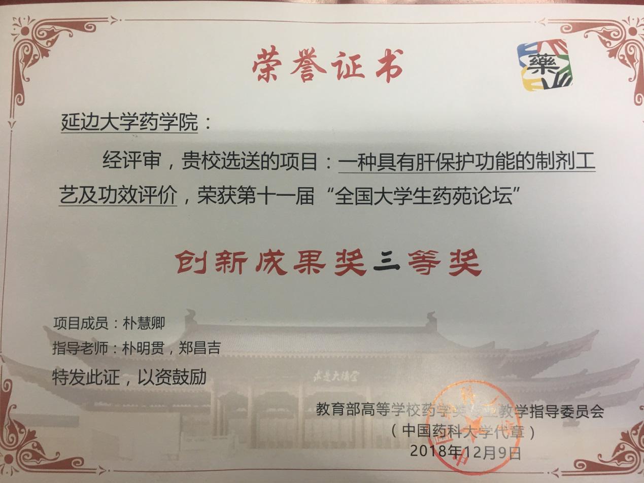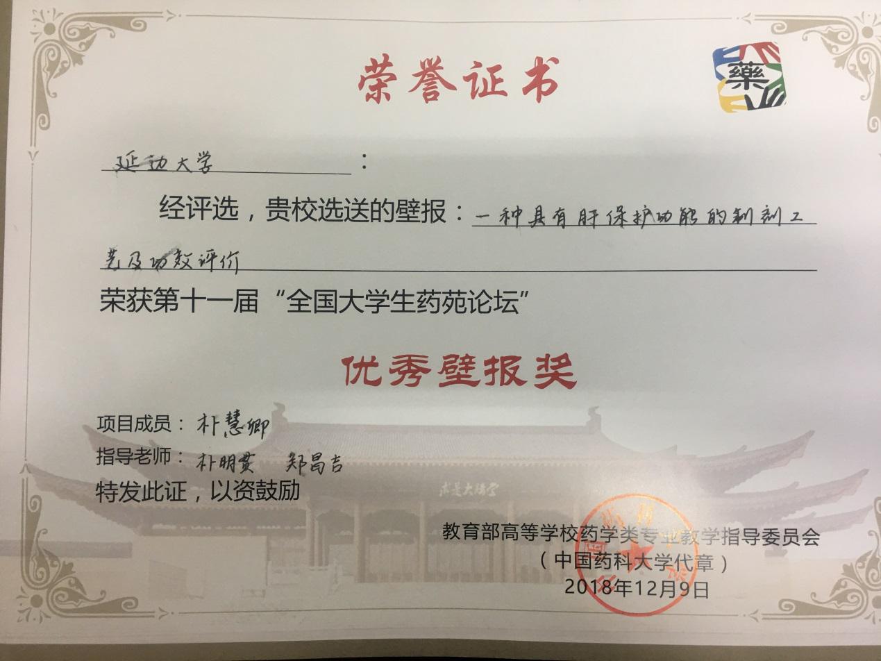 经过壁报展示、论文评审、现场答辩、专家提问等多个环节的激烈竞争,我院2016级药学专业朴慧卿的成果“一种肝保护片剂的工艺及功效评价”(指导教师:朴明贯 副教授)荣获优秀壁报奖和创新成果三等奖,2016级药学专业刘金凤的成果“人参丝瓜美白润肤霜的制备”(指导教师:施溯荺 副教授)荣获创新成果三等奖,充分展示了我校学子优异的科学修养、专业技能和综合素质。