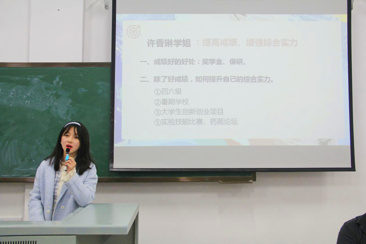 许香琳同学提醒同学们在完成课程内容之外,应早期进入科研实践,努力提高自身的综合实力,积极参加暑期学校项目、大学生创新创业项目、实验技能比赛、药苑论坛、生命科学竞赛等校极、省级和国家级学科类竞赛,拓宽视野,提升专业素养,丰富自己的大学生活。