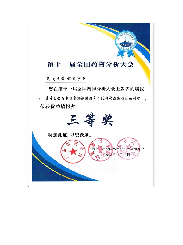 闵俊哲教授课题组参加了本次会议。闵俊哲教授以《体内氧化应激及急性心梗患者手性巯基化合物动态监测》做了口头邀请报告。博士生李喜玲以《基于同位素标记西妥昔单抗糖链相对定量分析方法的研究》做了墙报发表。其中博士生程盛宇发表的《基于柱切换电喷雾检测同时分析12种代糖新方法的研究》墙报获得“优秀墙报三等奖”。