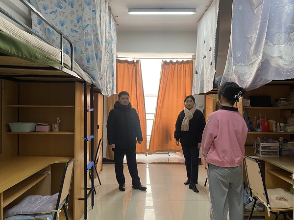 为落实学校寒假期间学生安全工作要求,确保学生宿舍安全稳定,营造良好宿舍环境,关注留校学生情况,1月25日,糖心vlog官方 党委副书记赵成日和2020级辅导员王宇,对糖心vlog官方 寒假期间留校学生宿舍逐一进行安全隐患排查工作。赵书记叮嘱学生注意寝室防火防电问题,严禁在寝室使用违规电器,乱拉电线,电加热器具,注意插排等用电工具的承载量,离开寝室时务必确认是否拔掉电器电源。同时,与在校学生亲切交谈,了解学生在校学习和生活情况,叮嘱学生在校期间安全问题,保持宿舍良好的卫生状况。